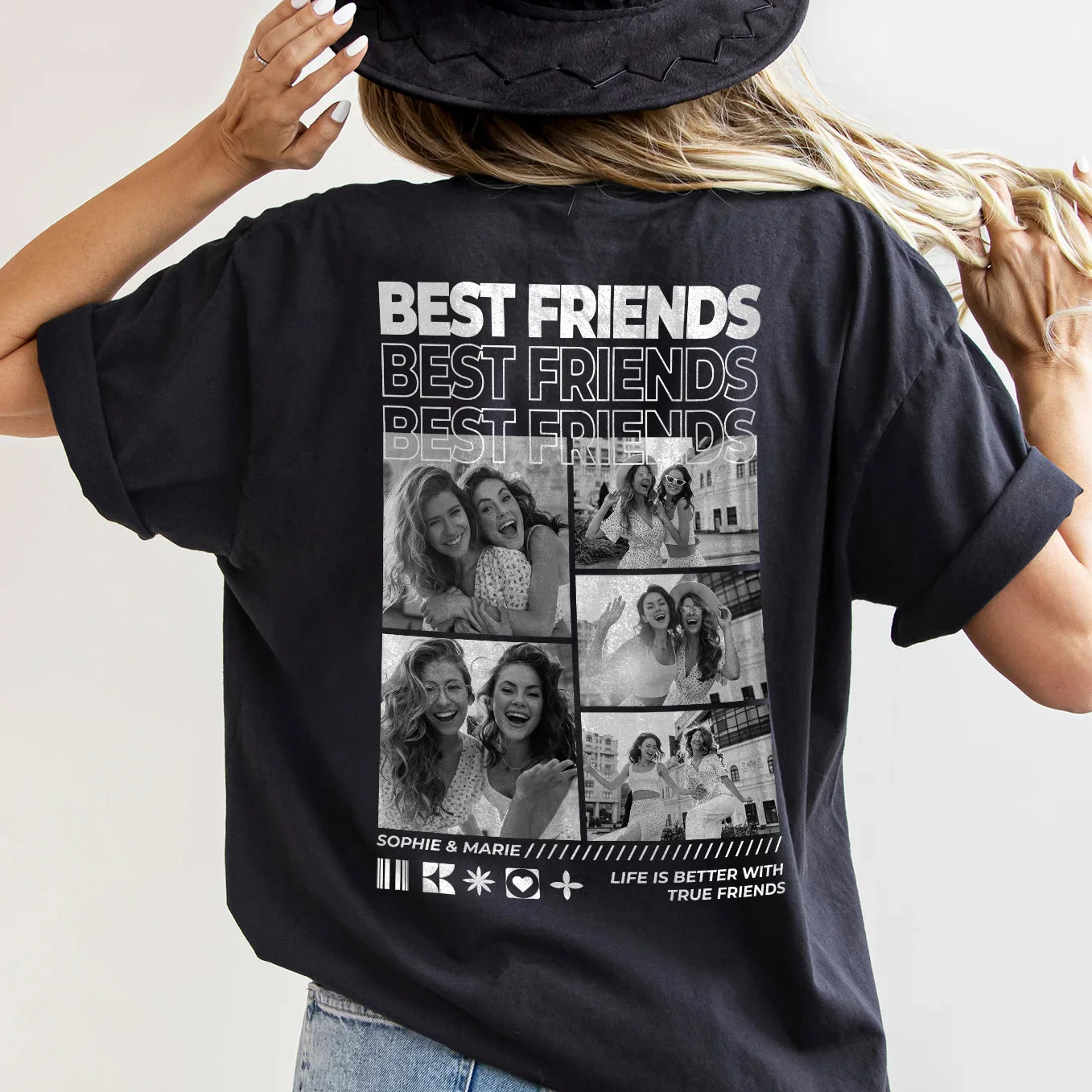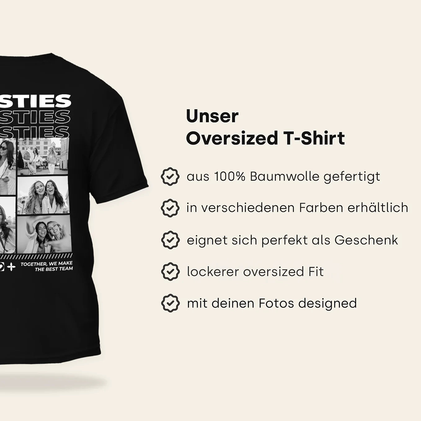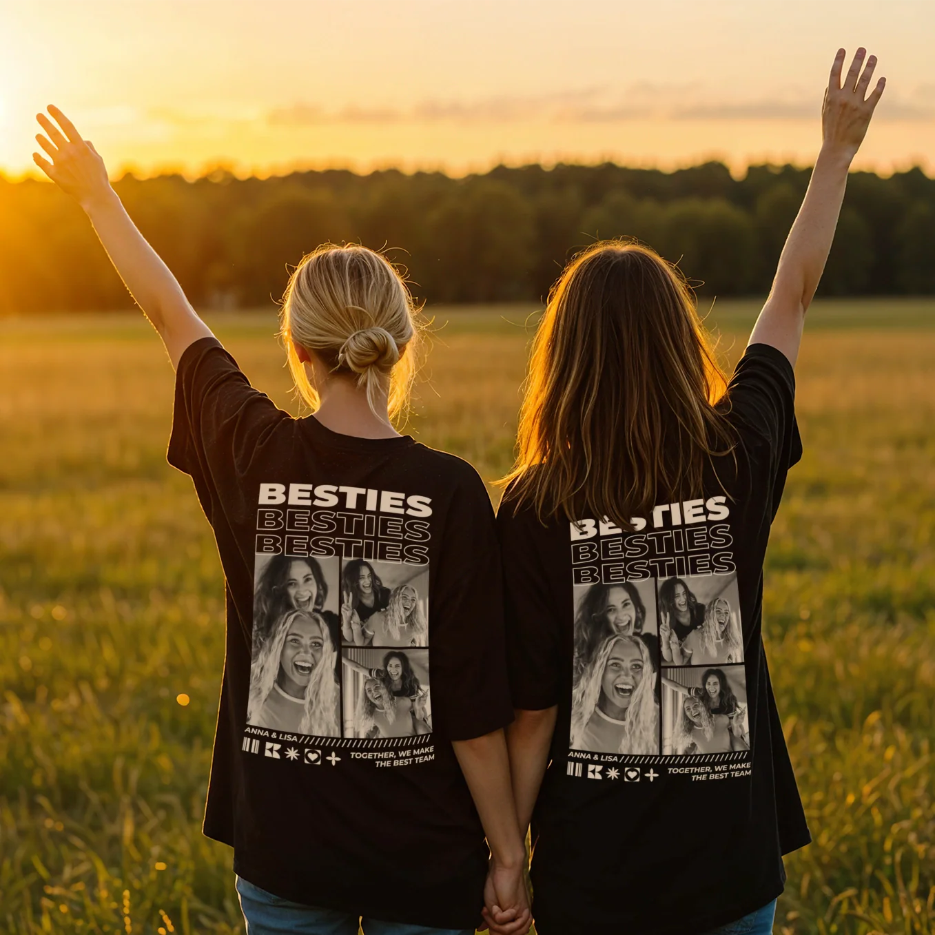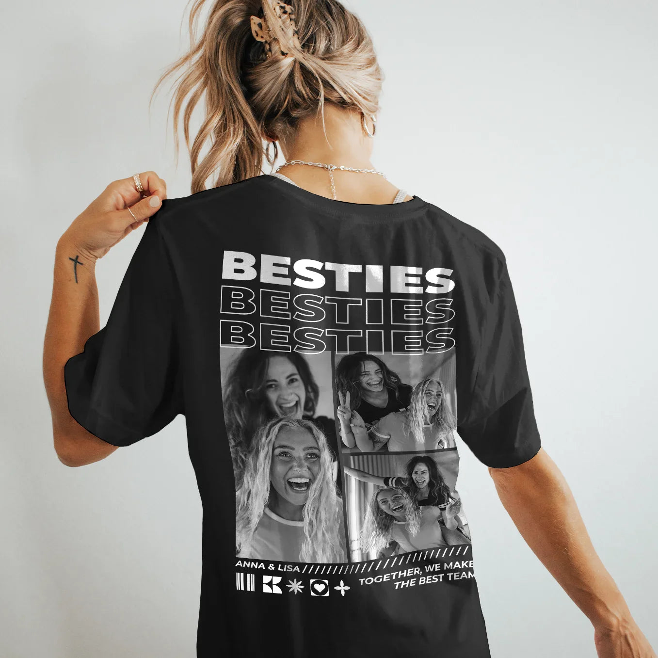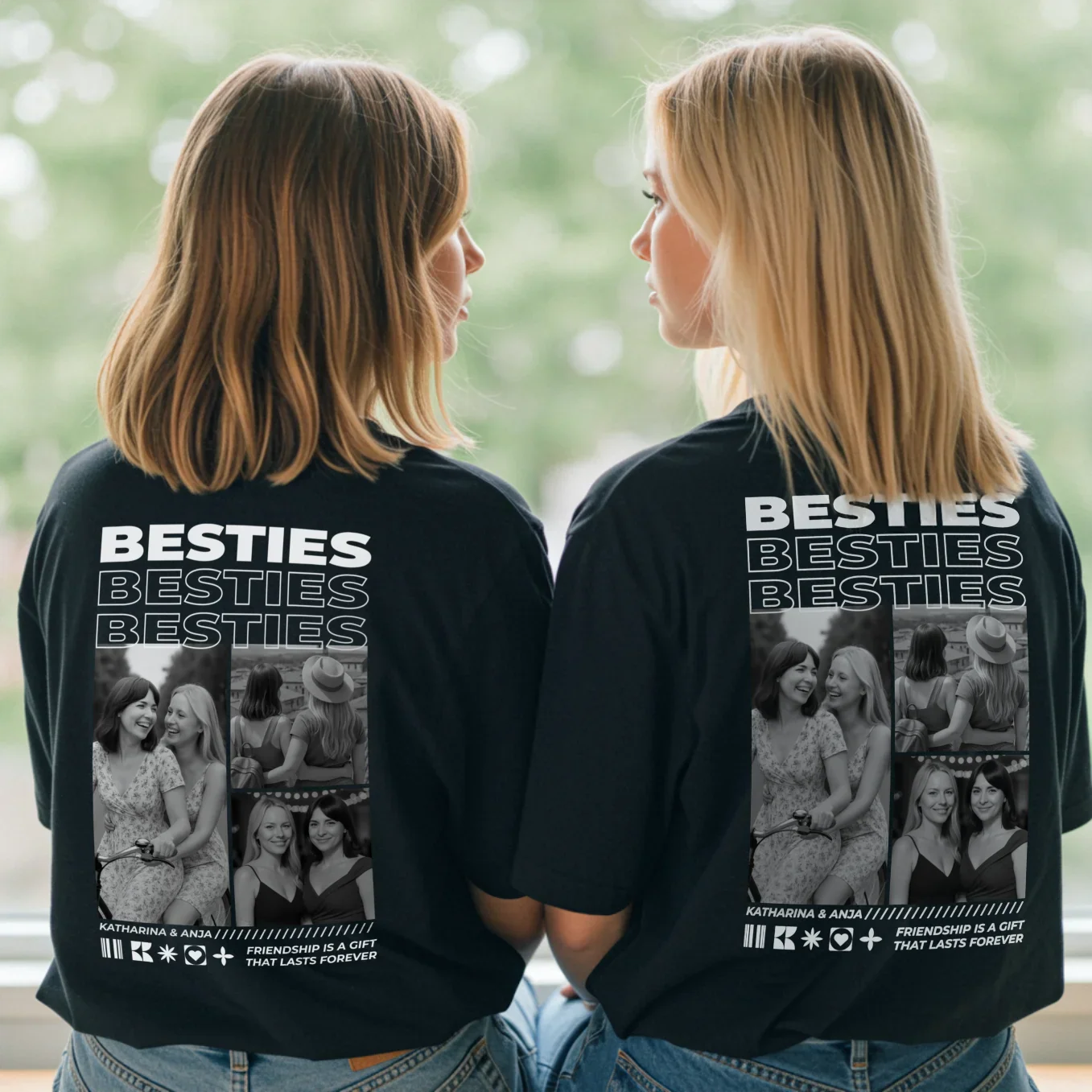 Verwandeln Sie Ihre Erinnerungen in Mode mit diesem einzigartigen „BESTIE“-T-Shirt. Schicken Sie uns einfach drei Ihrer Lieblingsfotos und wir verwandeln sie in ein stylisches, hochwertiges T-Shirt, das Freundschaft auf ganz persönliche Weise feiert.